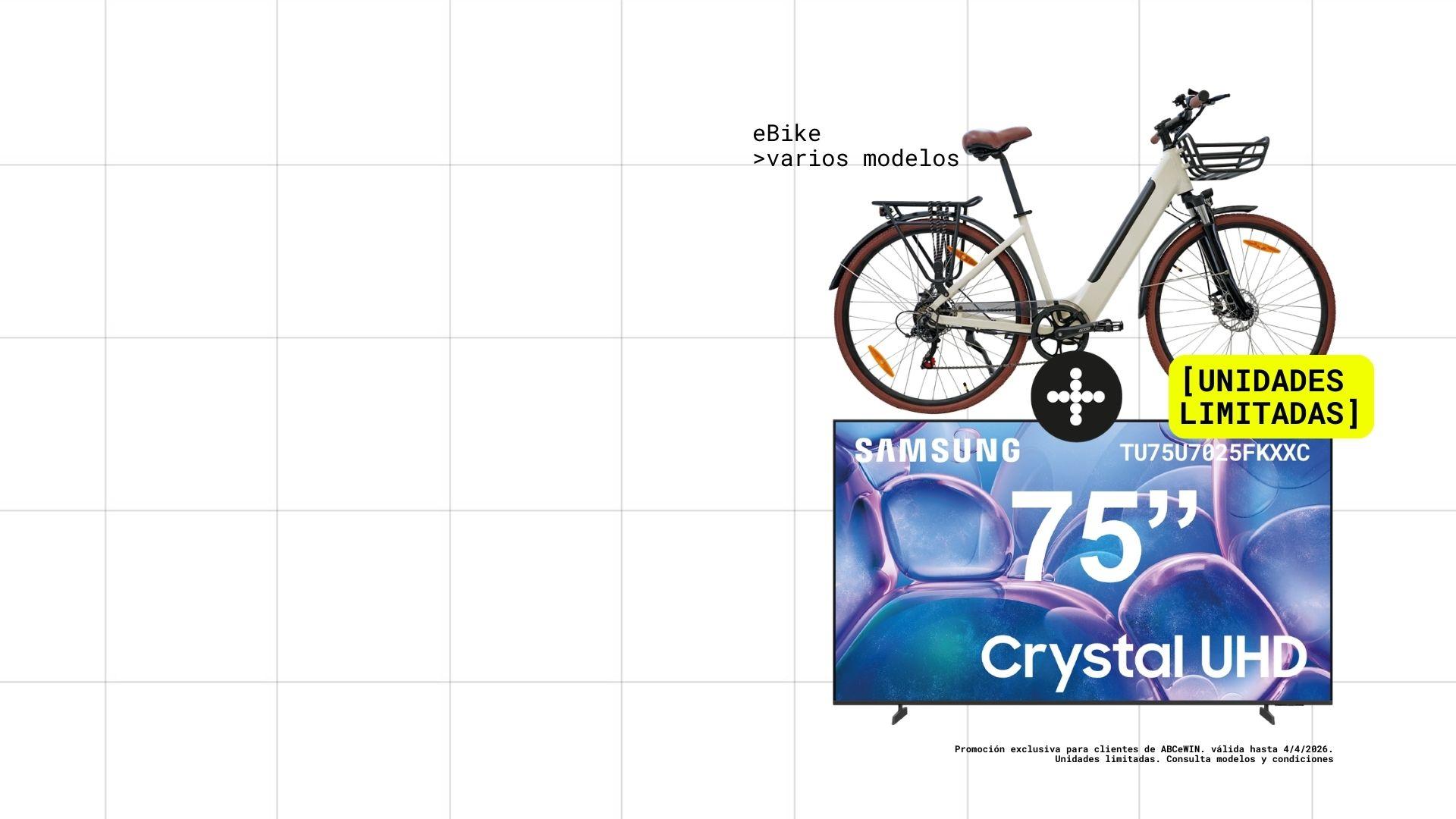 Solo por tiempo limitado, con el programa ABCe WIN llévate una televisión Samsung 4k de 75 pulgadas incluida con la compra de una e-Bike en modelos seleccionados.