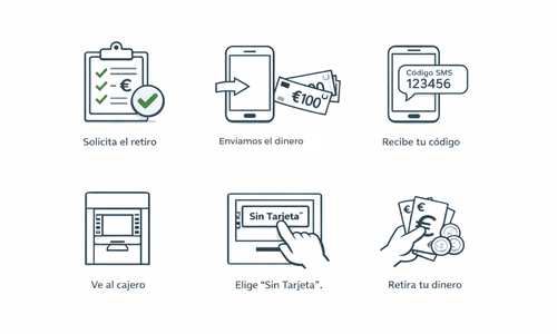 Trabajamos con el sistema Efectivo Móvil de BBVA, que permite retirar dinero únicamente con un código que recibirás por SMS.